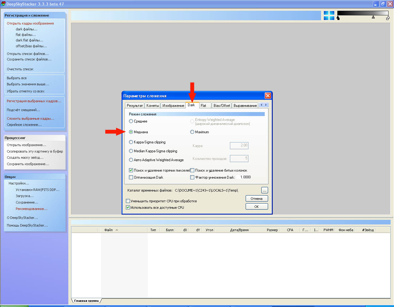 Следующие три вкладки посвящены калибровочным файлам. Важное замечание: если Вы не используете «честный» RAW-режим съемки (т. е. снимаете с аппаратной обработкой и/или в JPG-формате), то калибровочные файлы применять не имеет смысла — они только ухудшат результат. Итак, вкладка Dark или темновой кадр. Применение dark-файлов позволит убрать с каждого кадра изображения битые и горячие пиксели, а также устранить тепловые шумы матрицы и электронной начинки фотоаппарата (особо важно при длительных выдержках). Рекомендуется при обработке использовать несколько десятков одиночных dark-файлов, которые программа сложит в один так называемый MasterDark, который и будет использоваться для коррекции каждого файла изображения. Для сложения dark-файлов могут использоваться режимы аналогичные режимам сложения кадров изображения. Наилучшие результаты, из моего опыта, получаются при использовании режима Медиана, хотя Вы можете поэкспериминтировать и с другими режимами.  Просмотров: 9739