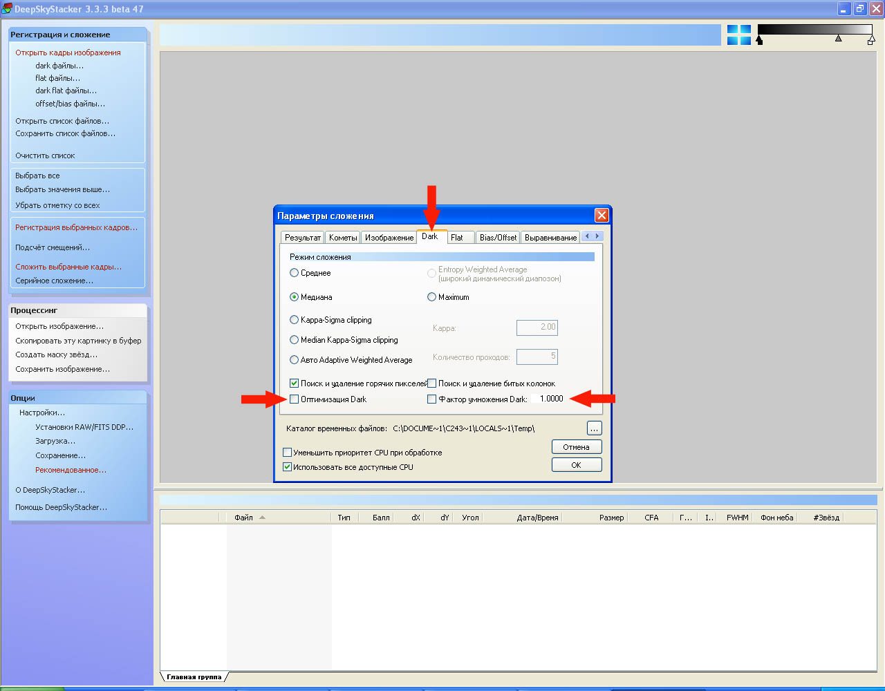 Опцию Оптимизация Dark следует включить при сложении кадров с разной выдержкой и разным ISO, а также если Вы используете dark-кадры полученные не в эту ночь. Опция Фактор умножения Dark позволяет сделать вышеуказанную оптимизацию вручную, коэффициент можно менять в пределах от 0 до 1. Если мы используем родные дарки, т. е. снятые в одну сессию с кадрами изображений, то эти опции нам не нужны, тем более что они увеличивают длительность процесса обработки. Просмотров: 9734