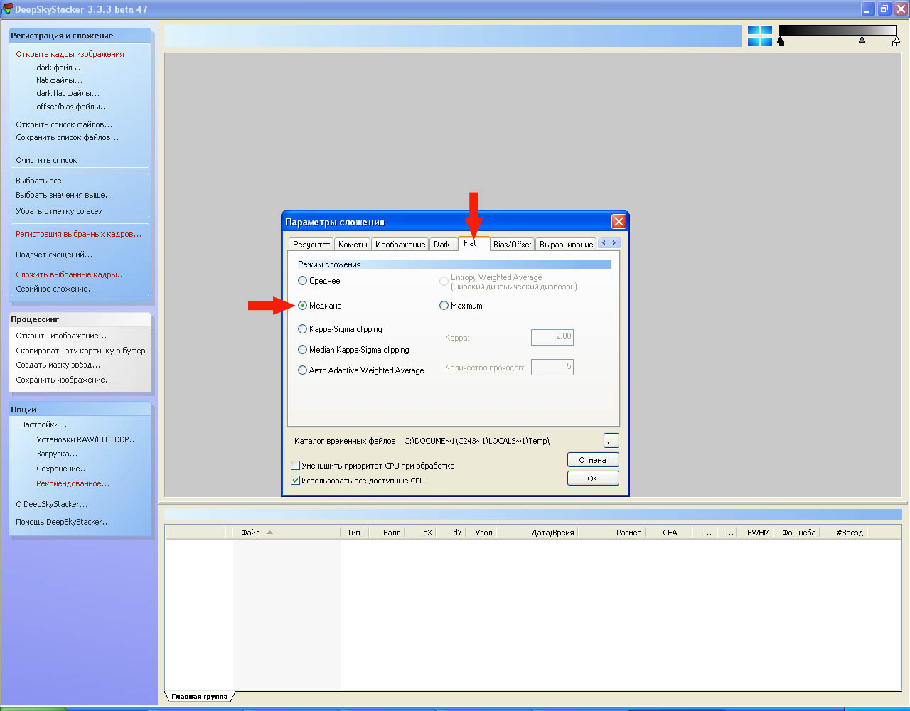 Следующая вкладка Flat или файл плоского поля. Применение flat-файлов позволит убрать с каждого кадра изображения следы от пыли на оптике и матрице, а также избавиться от виньетирования. Рекомендуется при обработке использовать несколько десятков одиночных flat-файлов, которые программа сложит в один так называемый MasterFlat, который и будет использоваться для коррекции каждого файла изображения. Для сложения flat-файлов могут использоваться режимы аналогичные режимам сложения кадров изображения. Наилучшие результаты, из моего опыта, получаются при использовании режима Медиана, хотя Вы можете поэкспериментировать и с другими режимами.  Просмотров: 9729