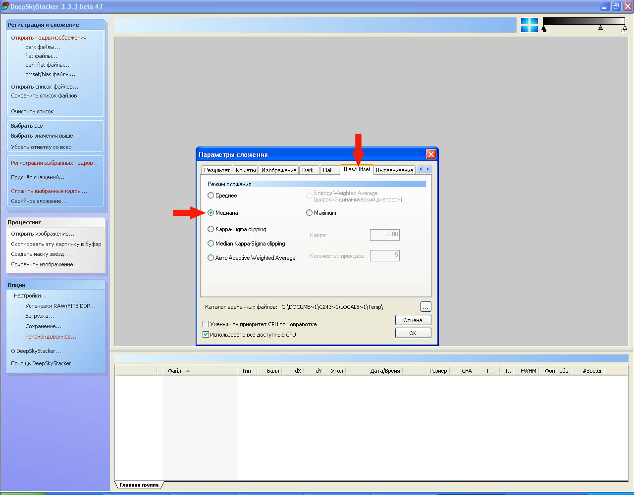 Следующая вкладка Bias/Offset или файл смещения (последние из калибровочных). Применеие bias/offset-файлов позволит убрать с каждого кадра изображения шум считывания матрицы. Рекомендуется при обработке использовать несколько десятков одиночных bias/offset-файлов, которые программа сложит в один так называемый MasterOffset, который и будет использоваться для коррекции каждого файла изображения. Для сложения bias/offset-файлов могут использоваться режимы аналогичные режимам сложения кадров изображения. Наилучшие результаты, из моего опыта, получаются при использовании режима Медиана, хотя Вы можете поэкспериментировать и с другими режимами.  Просмотров: 9729