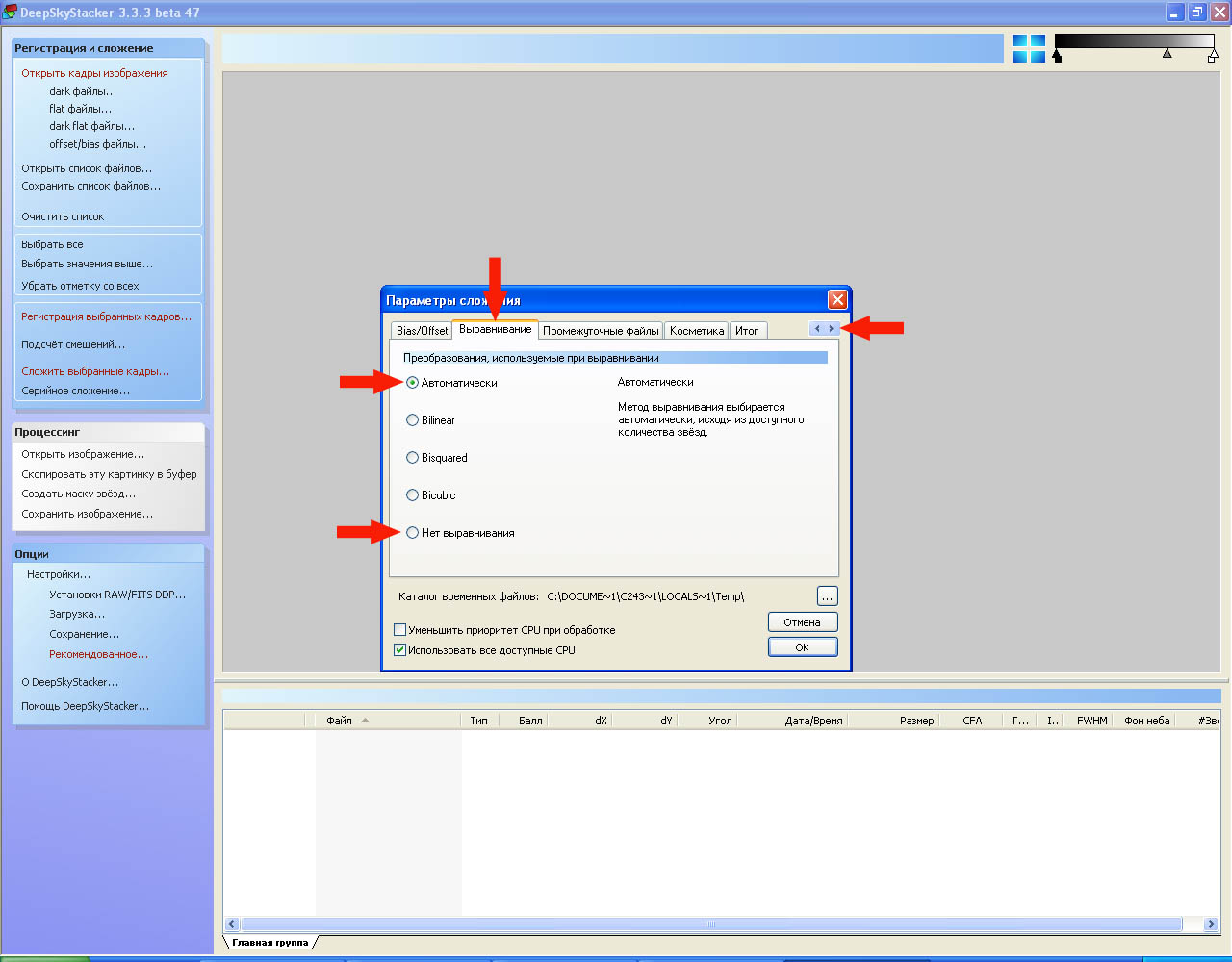 Продолжим... Пощелкаем стелочкой в правом верхнем углу окна и увидим оставшиеся вкладки. Следующая вкладка Выравнивание — выбор метода подвижки и поворота каждого кадра изображения относительно опорного кадра. Здесь можно смело выбрать Автоматически, и программа сама выберет один из трех методов ниже (в зависимости от количества обнаруженных звезд). Метод Нет выравнивания может пригодится чтобы получить треки звезд при съемке неподвижным фотоаппаратом или для исследования неточностей ведения Вашего часового привода.  Просмотров: 9709