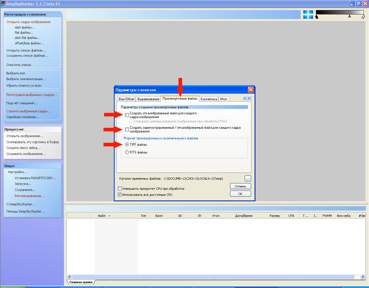 Далее вкладка Промежуточные файлы. Здесь мы можем задать опции создания (сохранения на диск ПЭВМ) просто откалиброванных, а также откалиброванных и зарегистрированных (выровненных) файлов. Это может понадобится, если Вы собираетесь производить сложение серии в другом астрономическом ПО. Включение этих опций существенно увеличит длительность процесса обработки — поэтому без особой надобности не советую включать эти опции. Ниже мы должны выбрать формат итогового файла, такой же формат будет и у промежуточных файлов (если Вы их будете сохранять). Имеются два формата TIFF и FITS. Формат FITT доступен лишь специальному астрономическому ПО, а большинству обычных графических редакторов этот формат не доступен. Поэтому новичкам рекомендую сохранять результаты в формате TIFF.  Просмотров: 9709