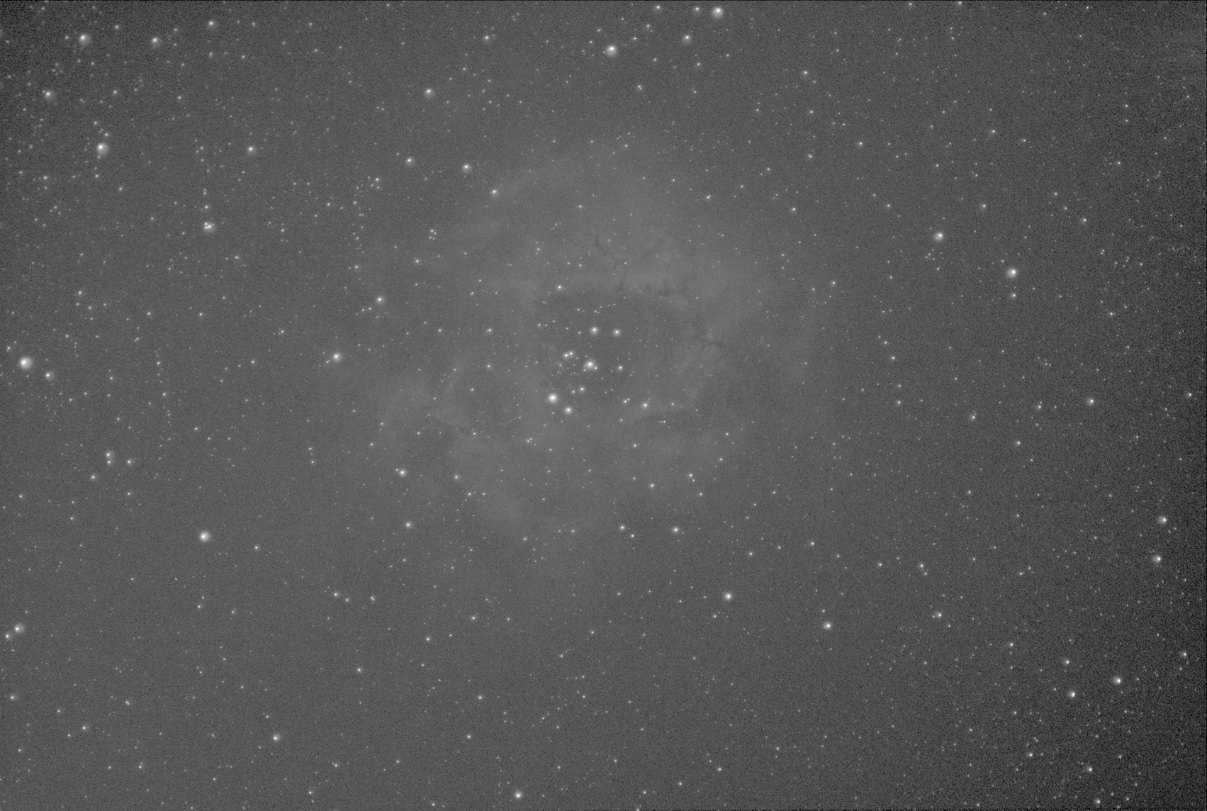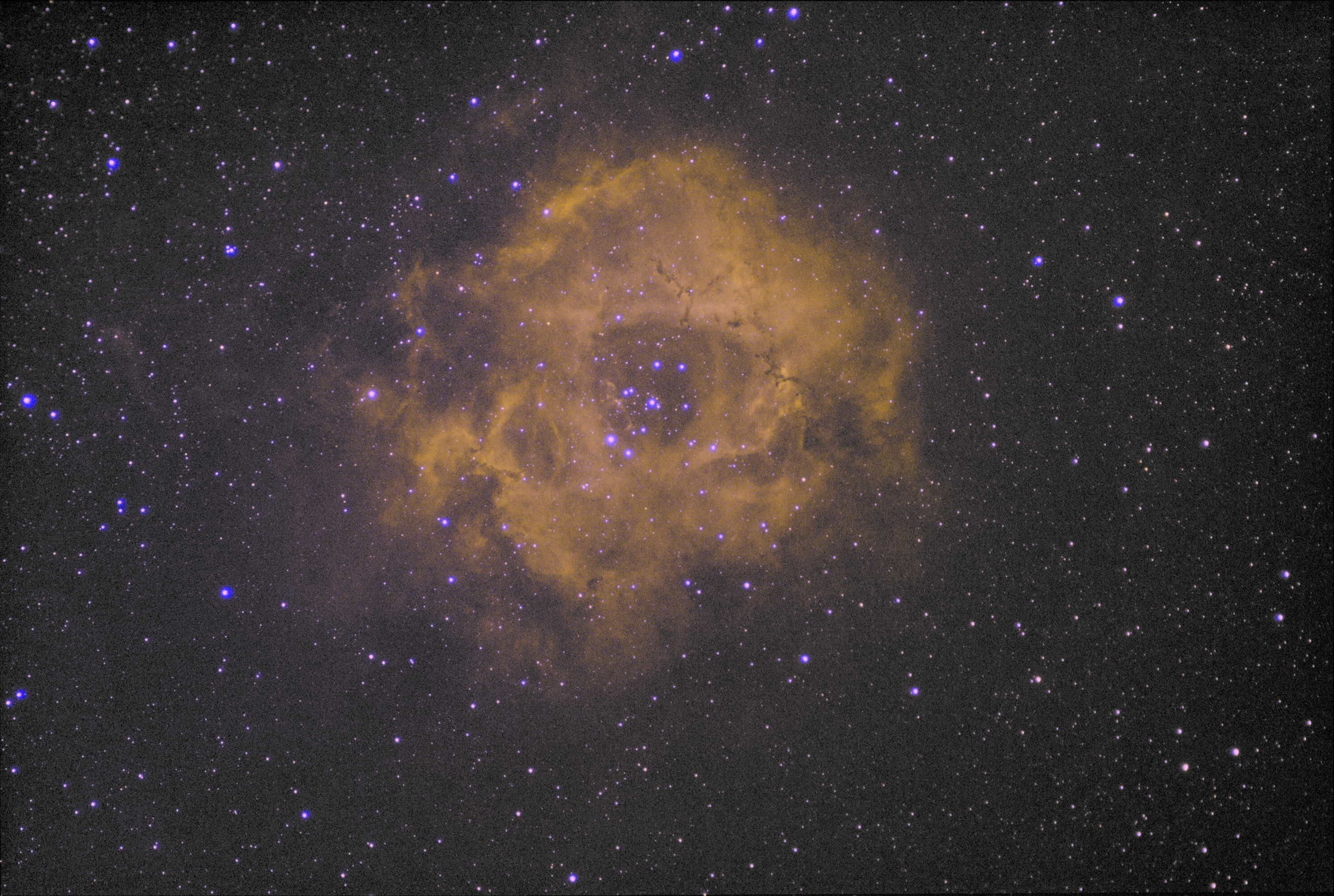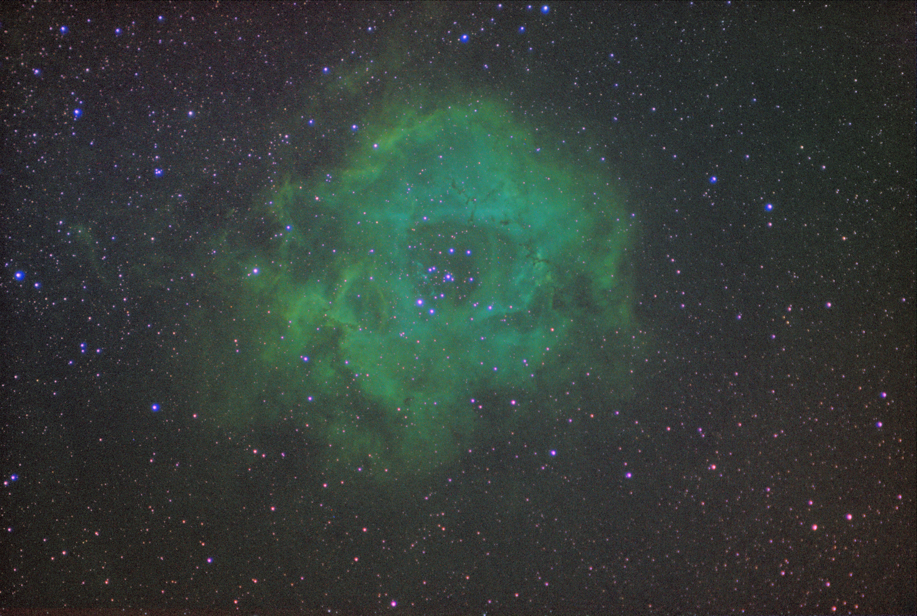 Доснял серу, по Розетке. Да. Сигнала в канале серы очень мало. Надо существенно поднимать накопление или увеличивать экспозицию одиночнак. Но вот это уже точно в следующем сезоне. SII - 15 кадров по 300 сек. (красный канал) Ha - 11 кадров по 300 сек. (зеленый канал) OIII - 13 кадров по 300 сек. (синий канал) Оборудование: Юпитер 37А, камера ZWO ASI178MM.  Просмотров: 1151
