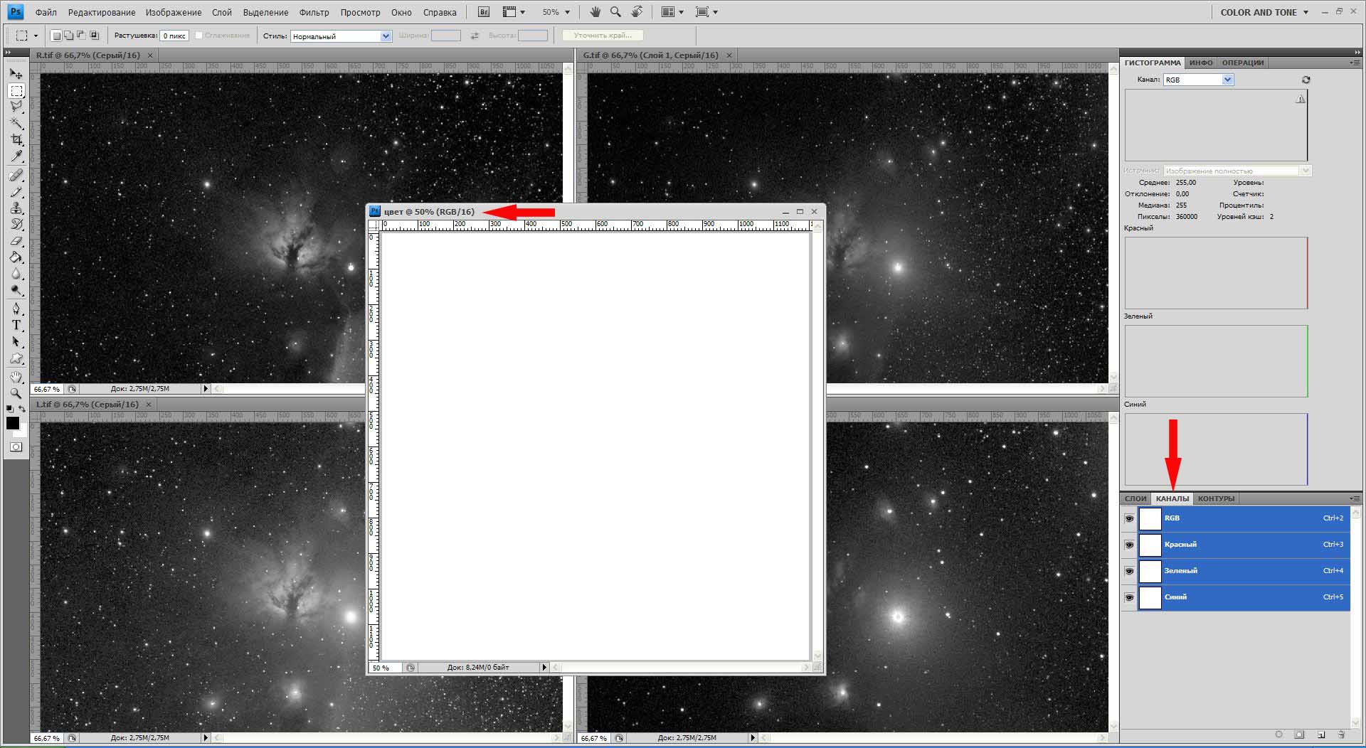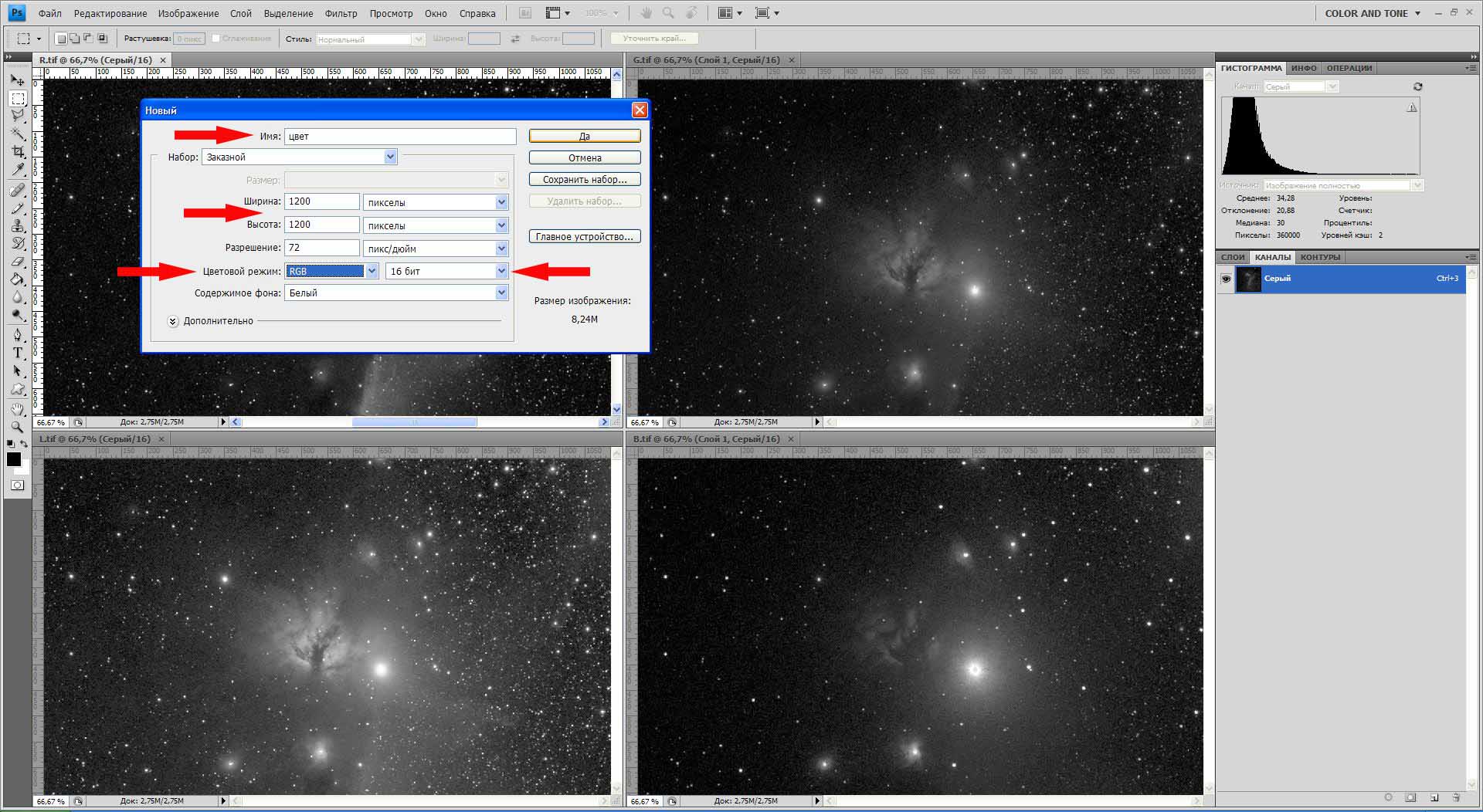 Назовем этот файл Цвет, размер выберем, как у монохромных исходников, и обязательно выставим цветовой режим RGB 16бит  Просмотров: 12425