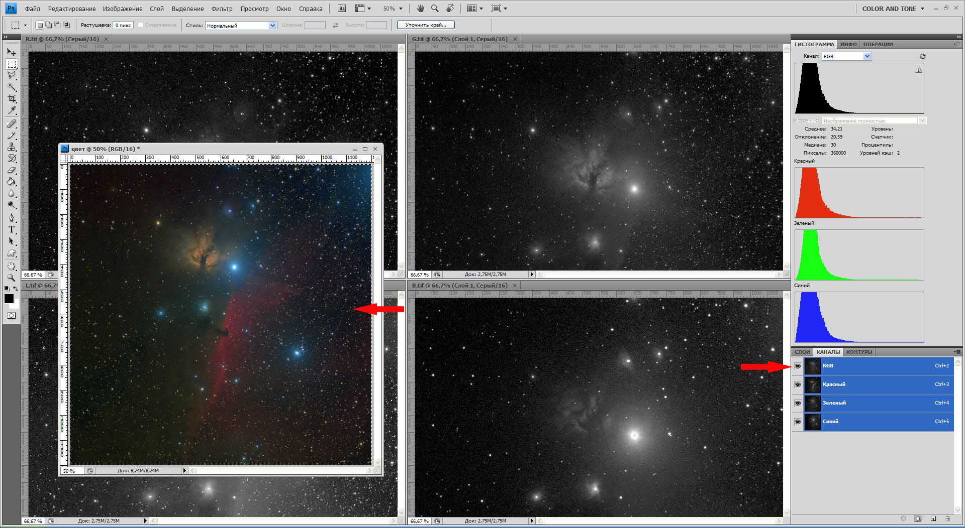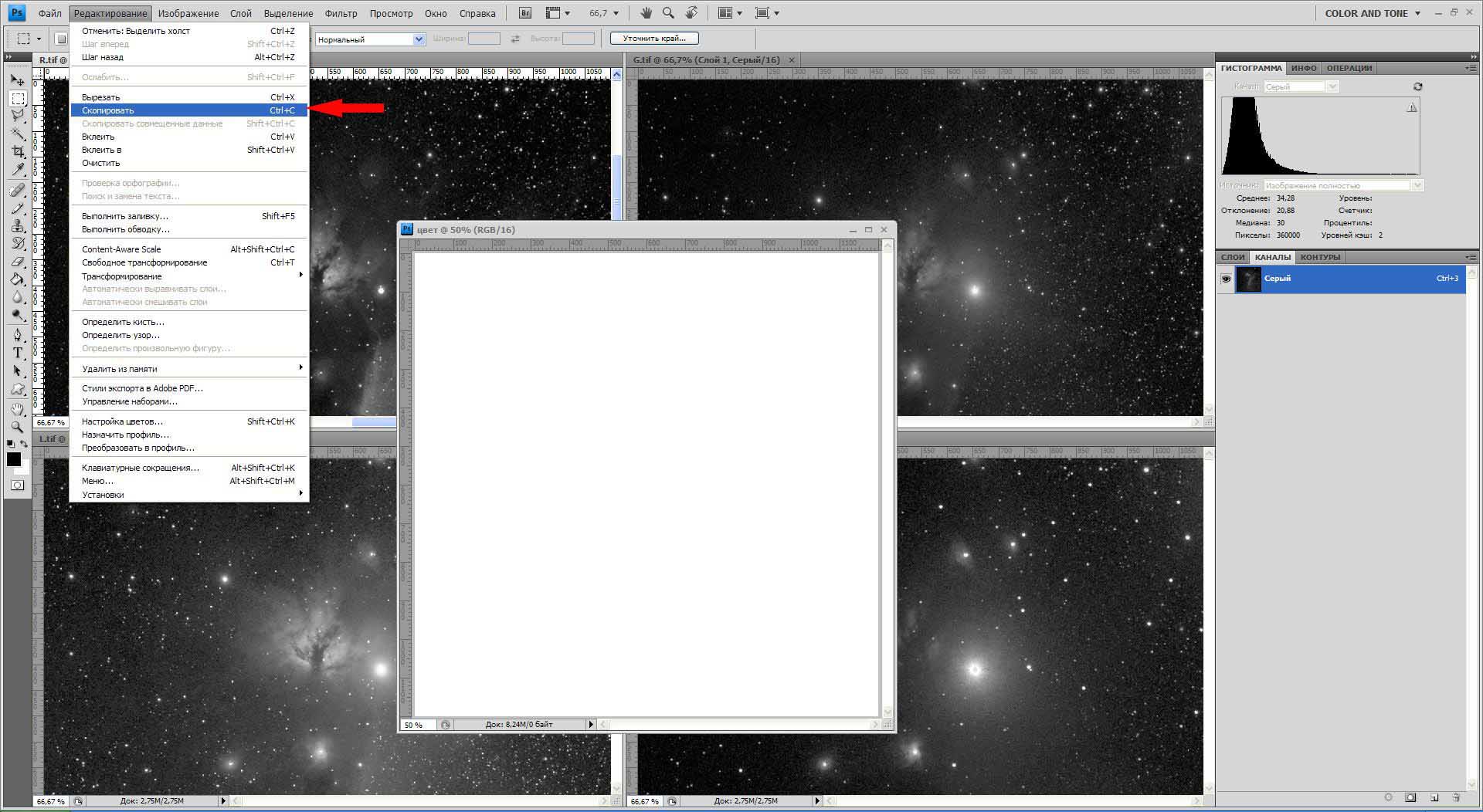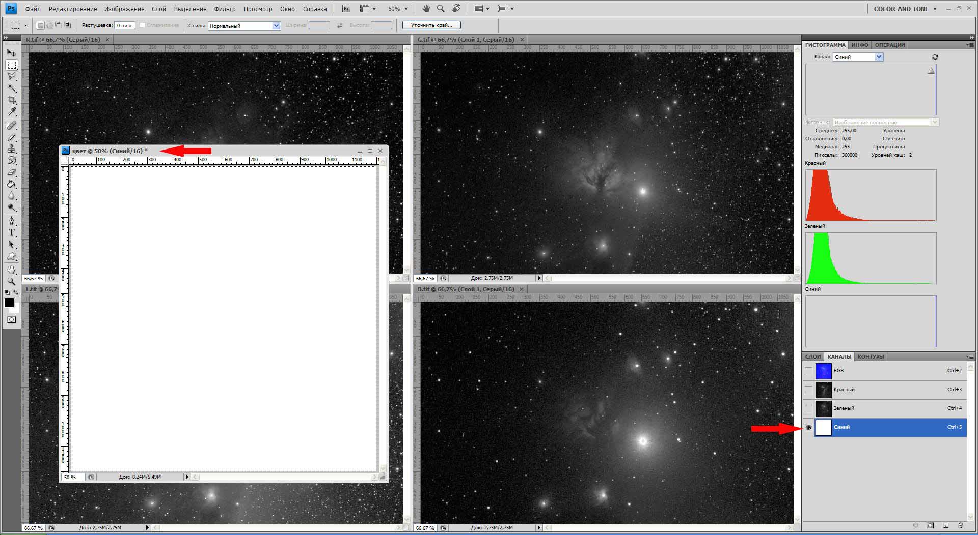 Еще раз делаем тоже для монохромного изображения полученного с синим фильтром B Переходим в файл B и выделяем его изображение  Просмотров: 12412