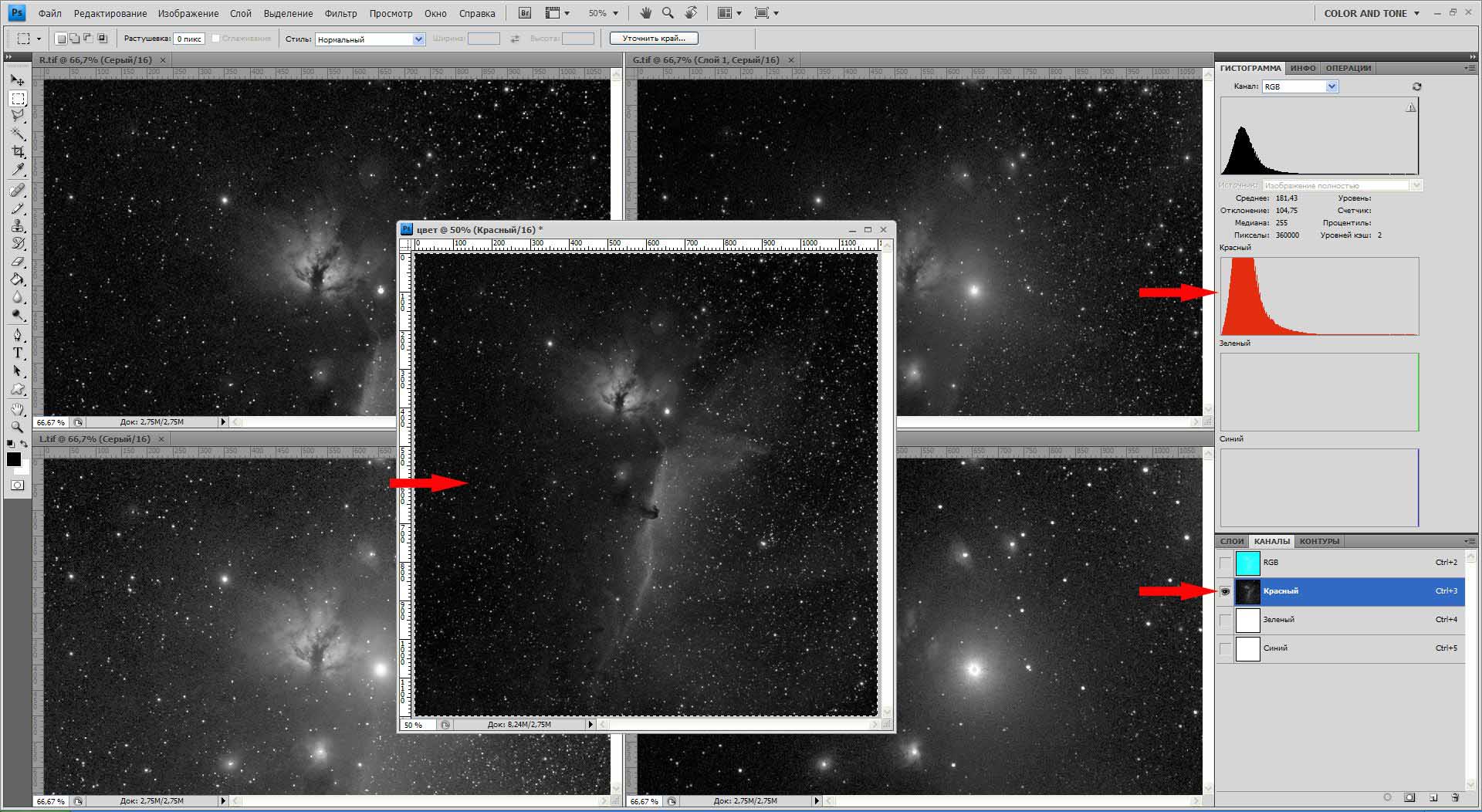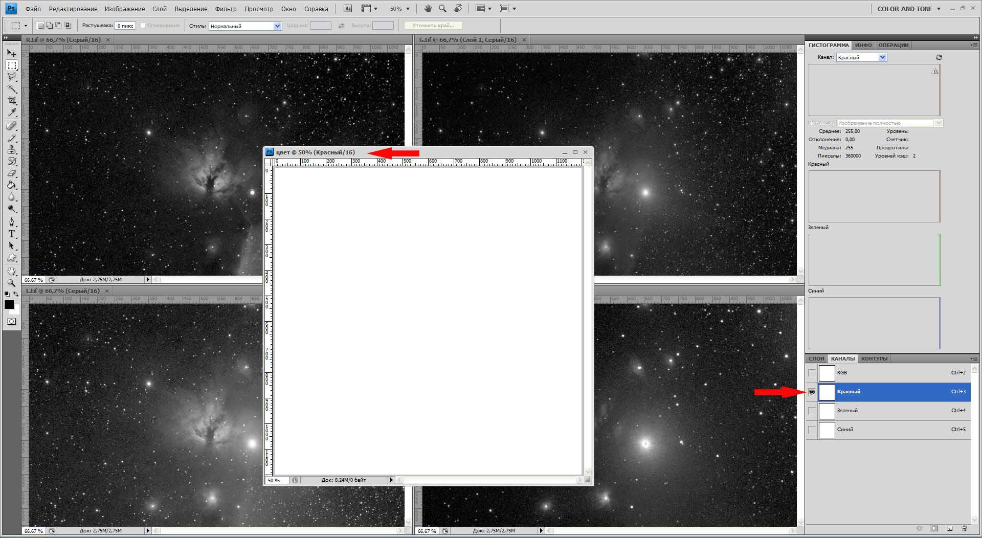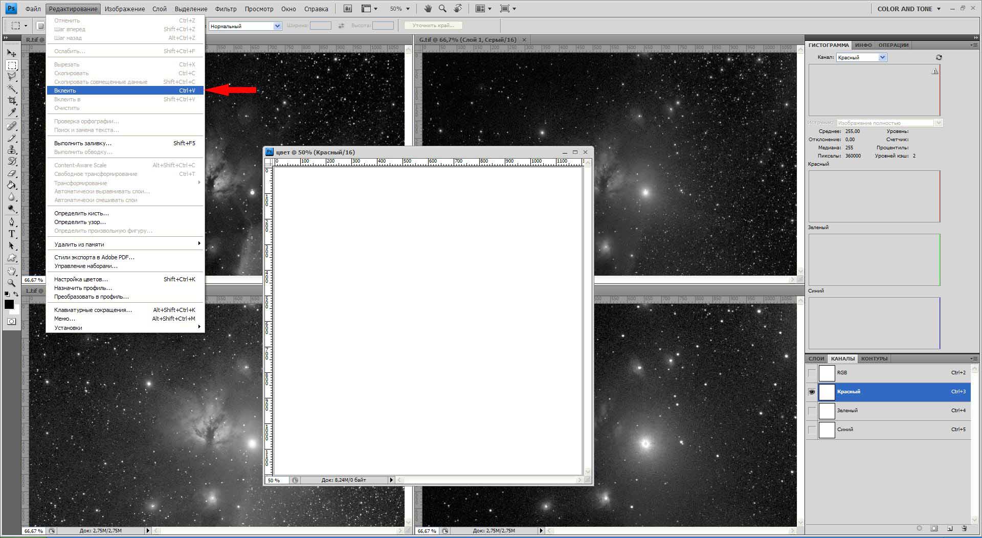 В файле Цвет появится картинка, также появится красная часть Гистограммы и заполнится красный канал во вкладке Каналы Просмотров: 12417
