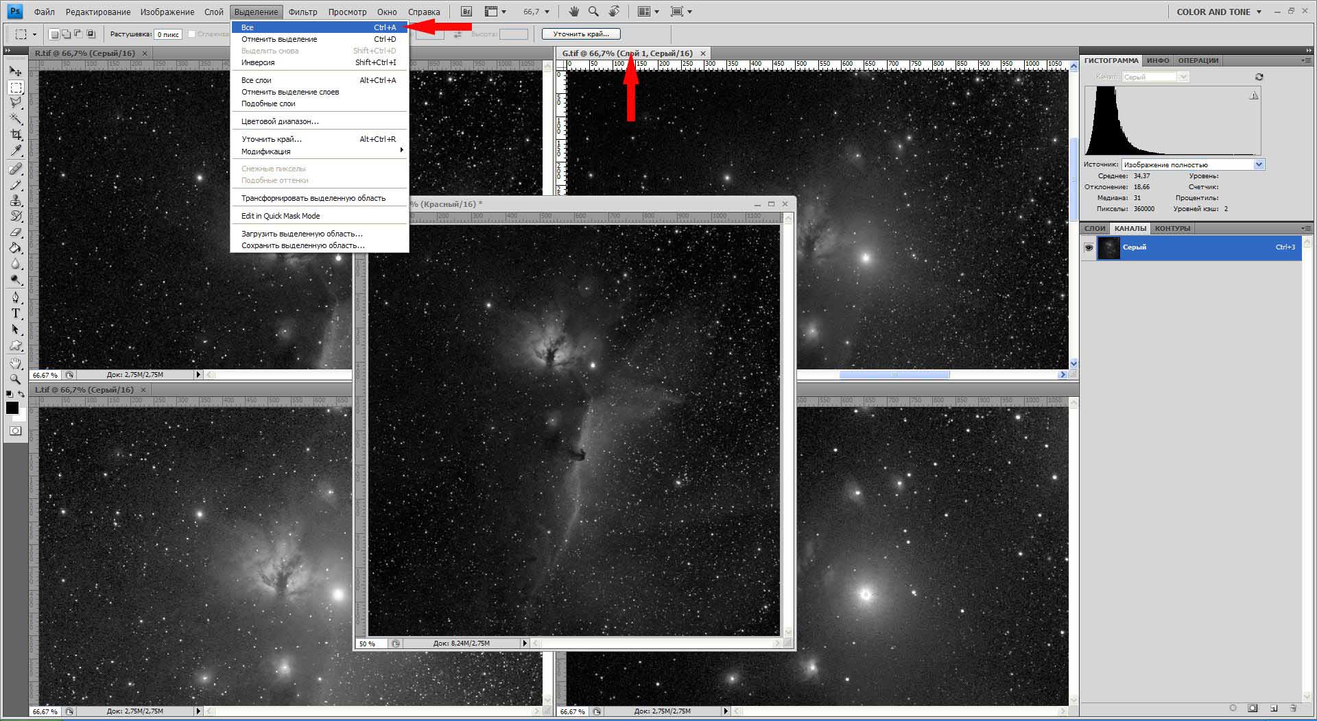 Далее переходим в файл R, полученный с красным фильтром и выделяем его изображение.  Просмотров: 12420