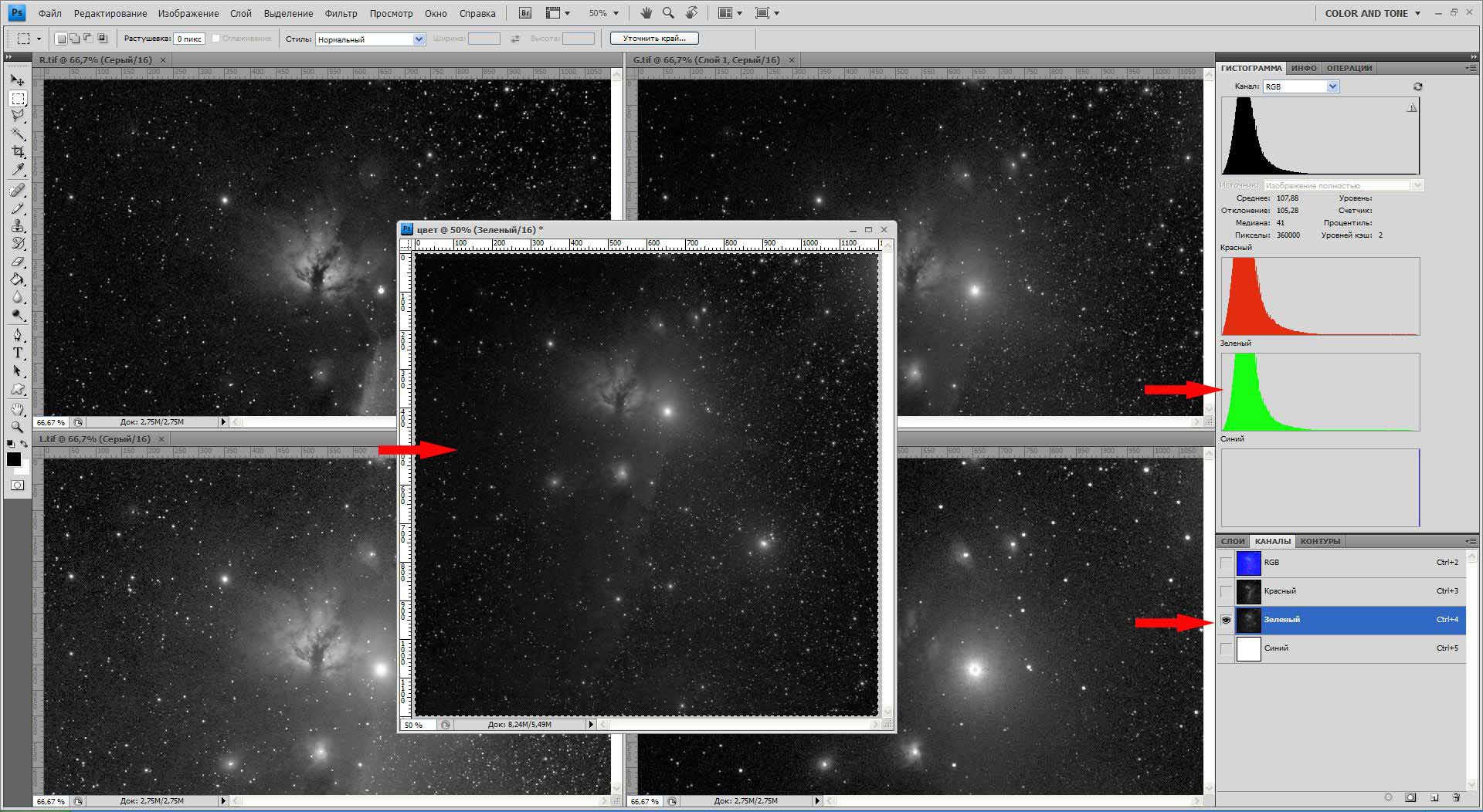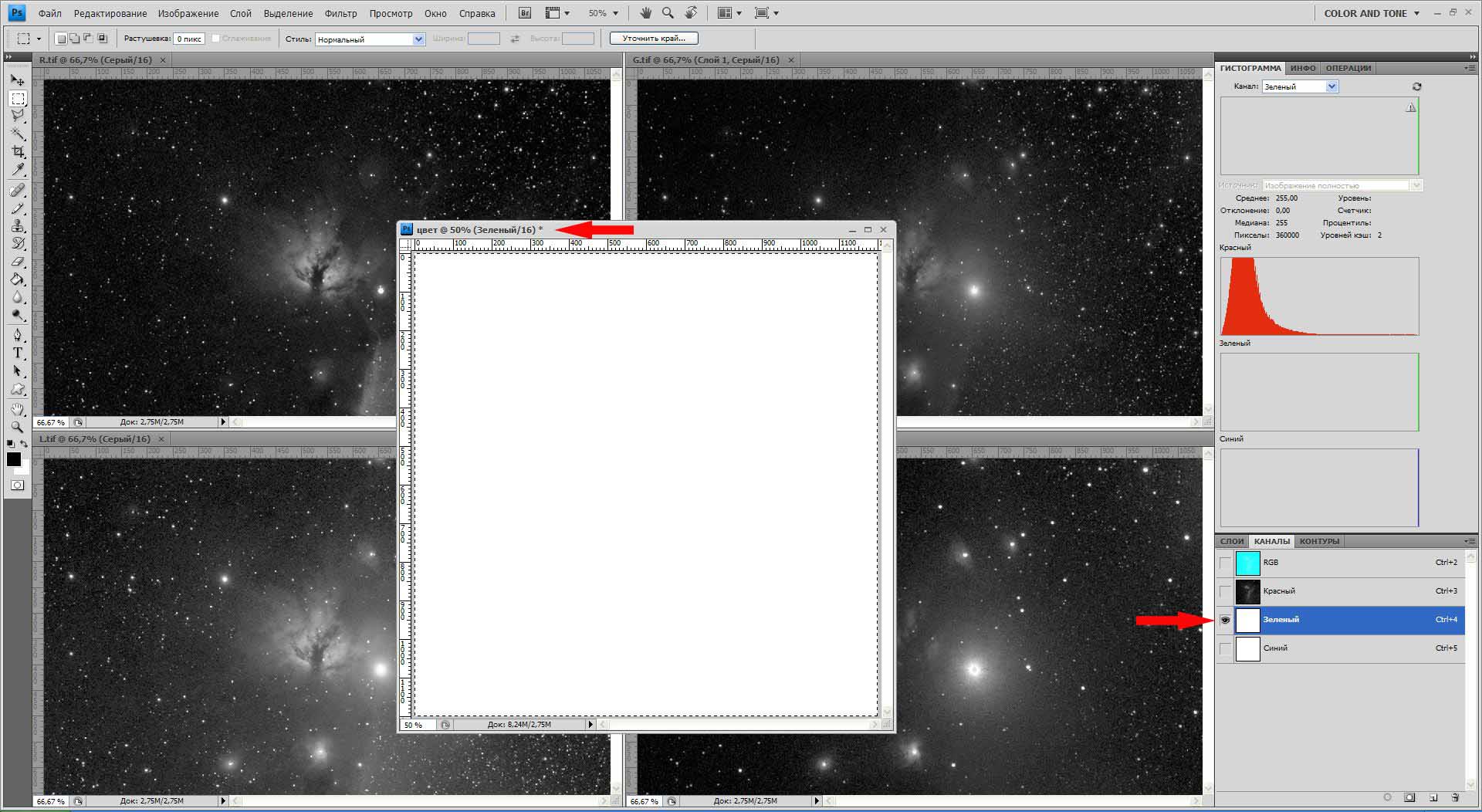 В файле Цвет появится новая картинка, также появится зеленая часть Гистограммы и заполнится зеленый канал во вкладке Каналы  Просмотров: 12413