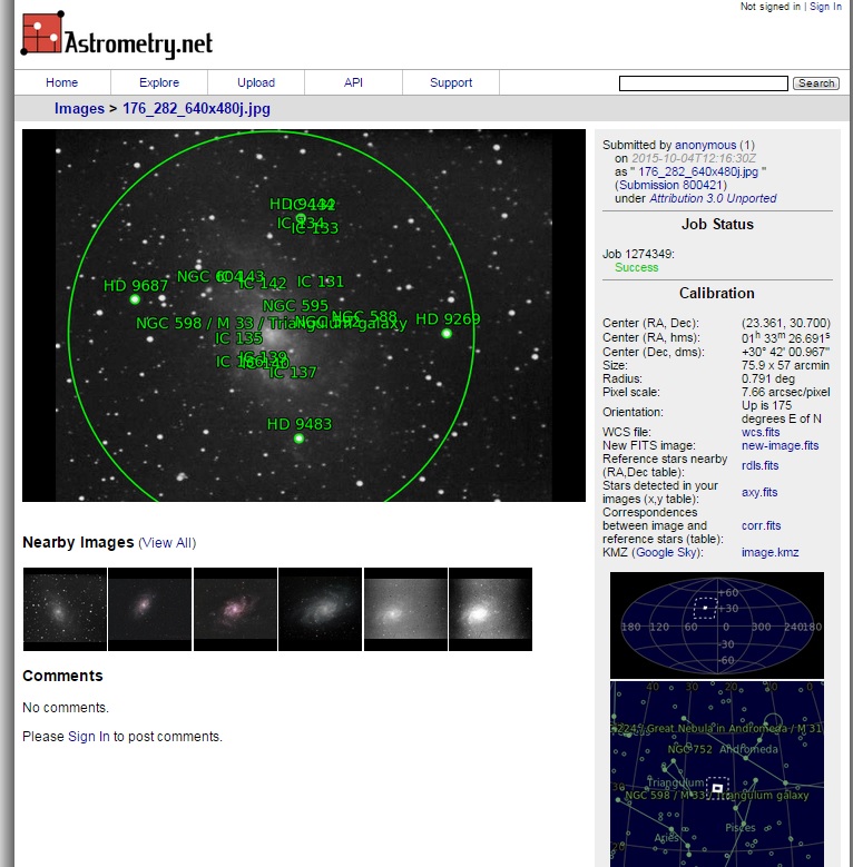Описанным ниже способом я искал галактику М33. Как известно, поверхностная яркость этой галактики довольно низкая, и имея в распоряжении искатель 30 мм. найти ее не было никакой возможности. Вот тут то и помог мне указанный выше ресурс.