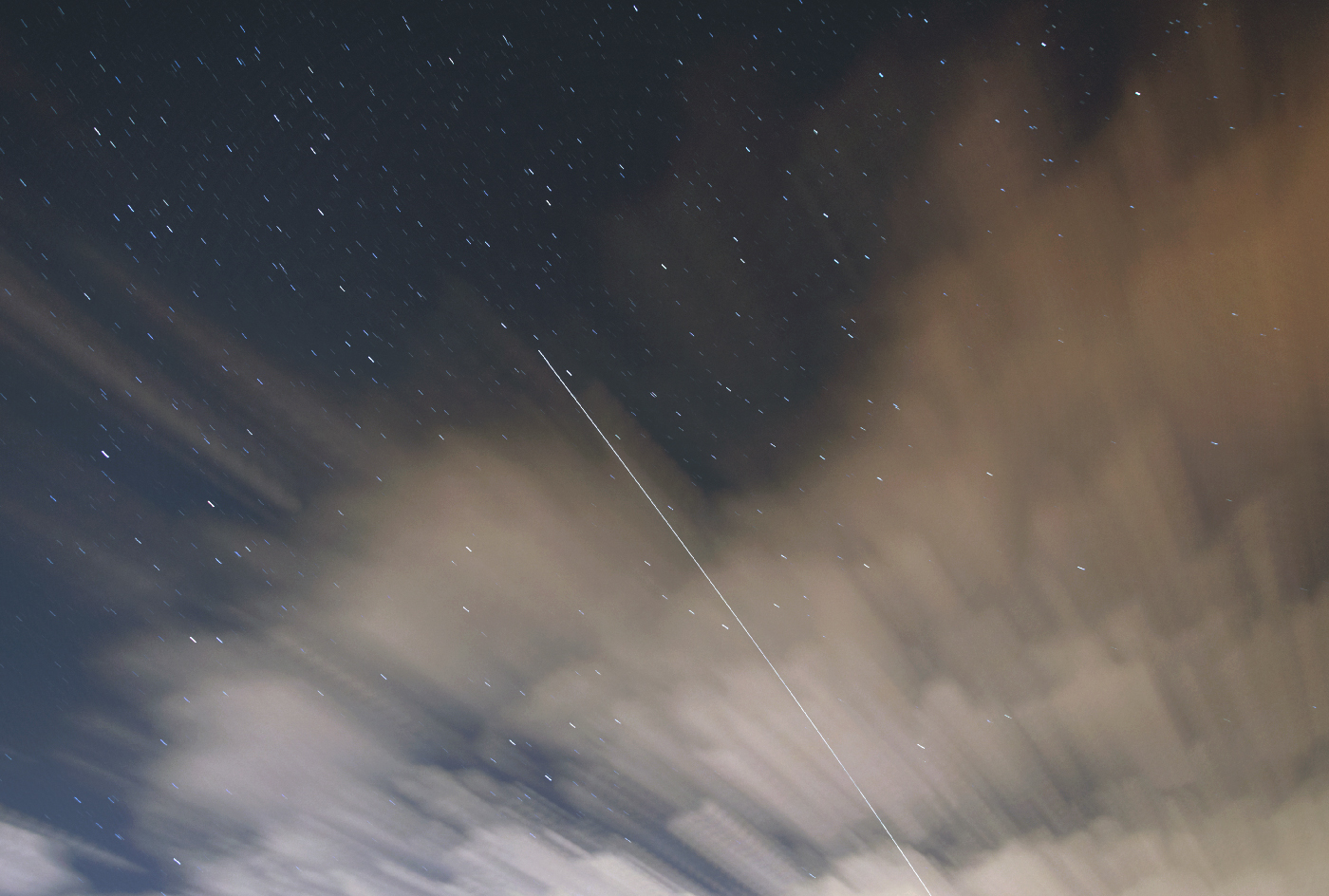 Пролет МКС Снято в г.Киев. 09.10.2017 г. Nikon D5100 Обьектив 18-105 мм Неподвижный штатив 18 мм/F-3.5/6 сек./ISO 800 сложено из 15-ти фото в программе StarStax, доработка в фш Кроп