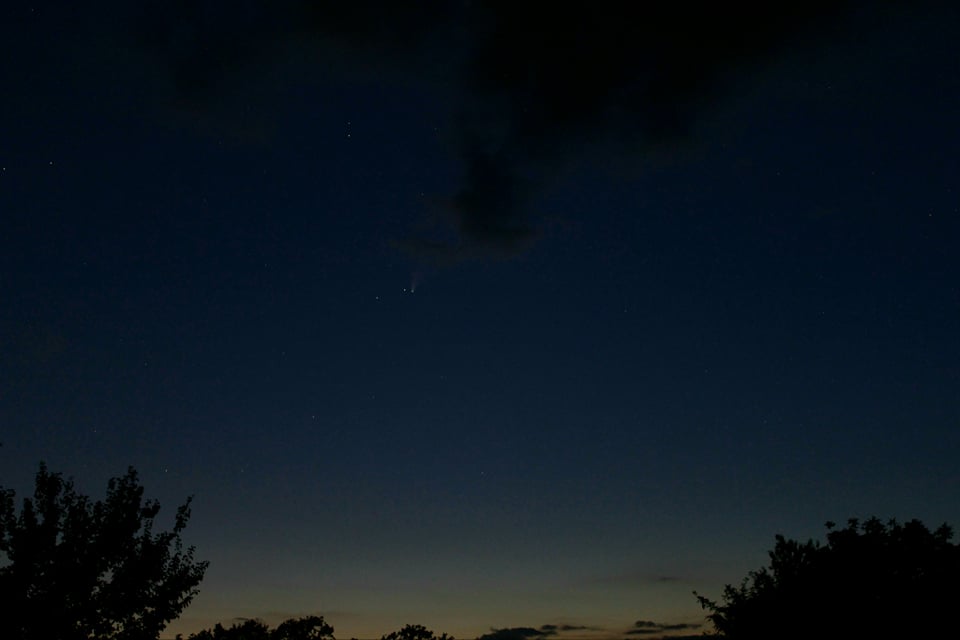 Надо отметить, что в последнее время ажиотаж среди местных любителей астрономии, связанный с частотой и яркостью появления в наших широтах серебристых облаков, заметно поугас, перекинувшись на другое явление - ярчайшую за последние два десятка лет комету С/2020 F3 NEOWISE. Нельзя сбрасывать со счетов и определенную шумиху в СМИ и среди обывателей по поводу так называемого "парада планет"! Не обошли стороной эти "увлечения" и нас. Благо, северо-западный горизонт был относительно чист и через некоторое время нам удалось заметить на сумеречном небе туманное пятнышко головы кометы рядом со звездочкой ι Большой Медведицы. "Главный" Олег пристроил свой фотик Canon на штатив и в течение ночи время от времени снимал хвостатую странницу.