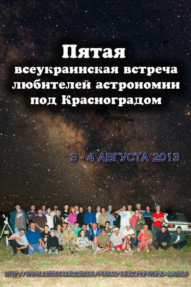 3 и 4 августа 2013 года состоится Пятая всеукраинска встреча любителей астрономии под городом Красноградом Харьковской области. Приглашаются все желающие.