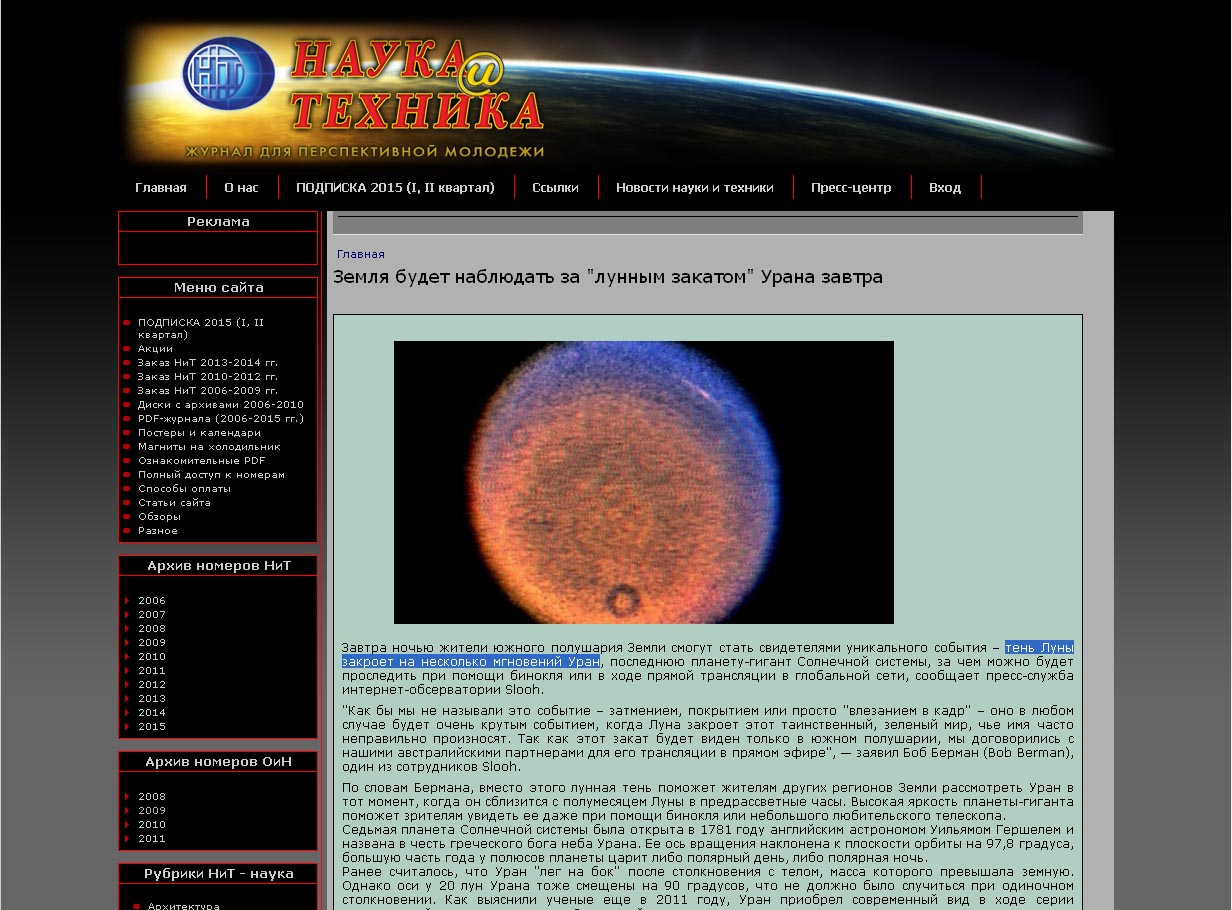 Наташа Беспалова писал(а): "Наука и Техника". Печатный.Сайт журнала http://www.nt-magazine.ru/Цитата: тень Луны закроет на несколько мгновений Уран  Просмотров: 2119