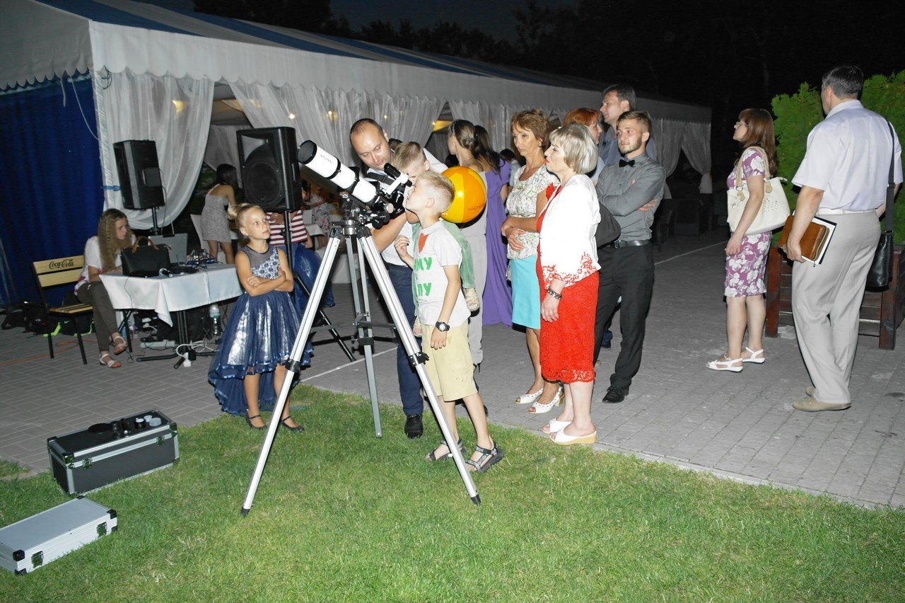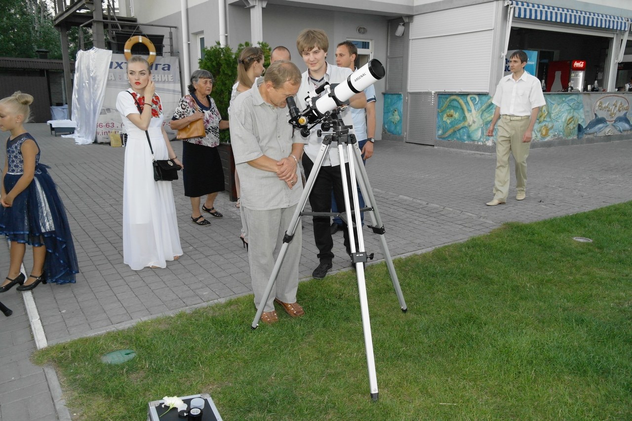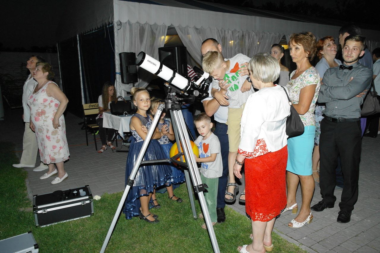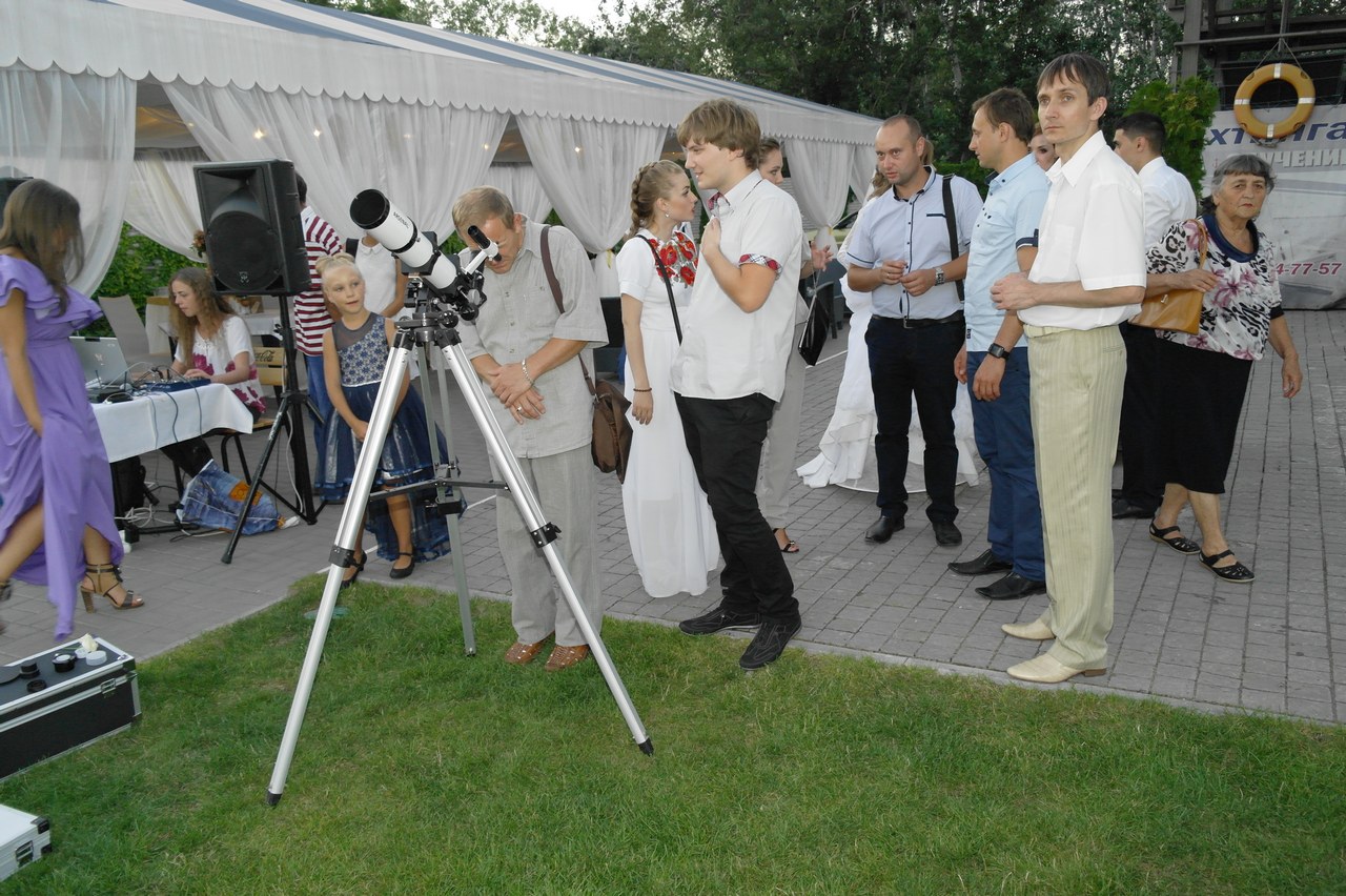 Потом началась торжественная часть, и все присутствующие переключились на главное центральное мероприятие этого вечера. Потом начался фуршет. Стемнело, и у участников свадебного вечера вновь пробудился интерес к созерцанию планет. Для меня был припасен колпак звездочета и плащ, но я не стал это одевать, потому что было жарко и неудобно в такой одежде, а людям было интересно не шоу, а реальные наблюдения.