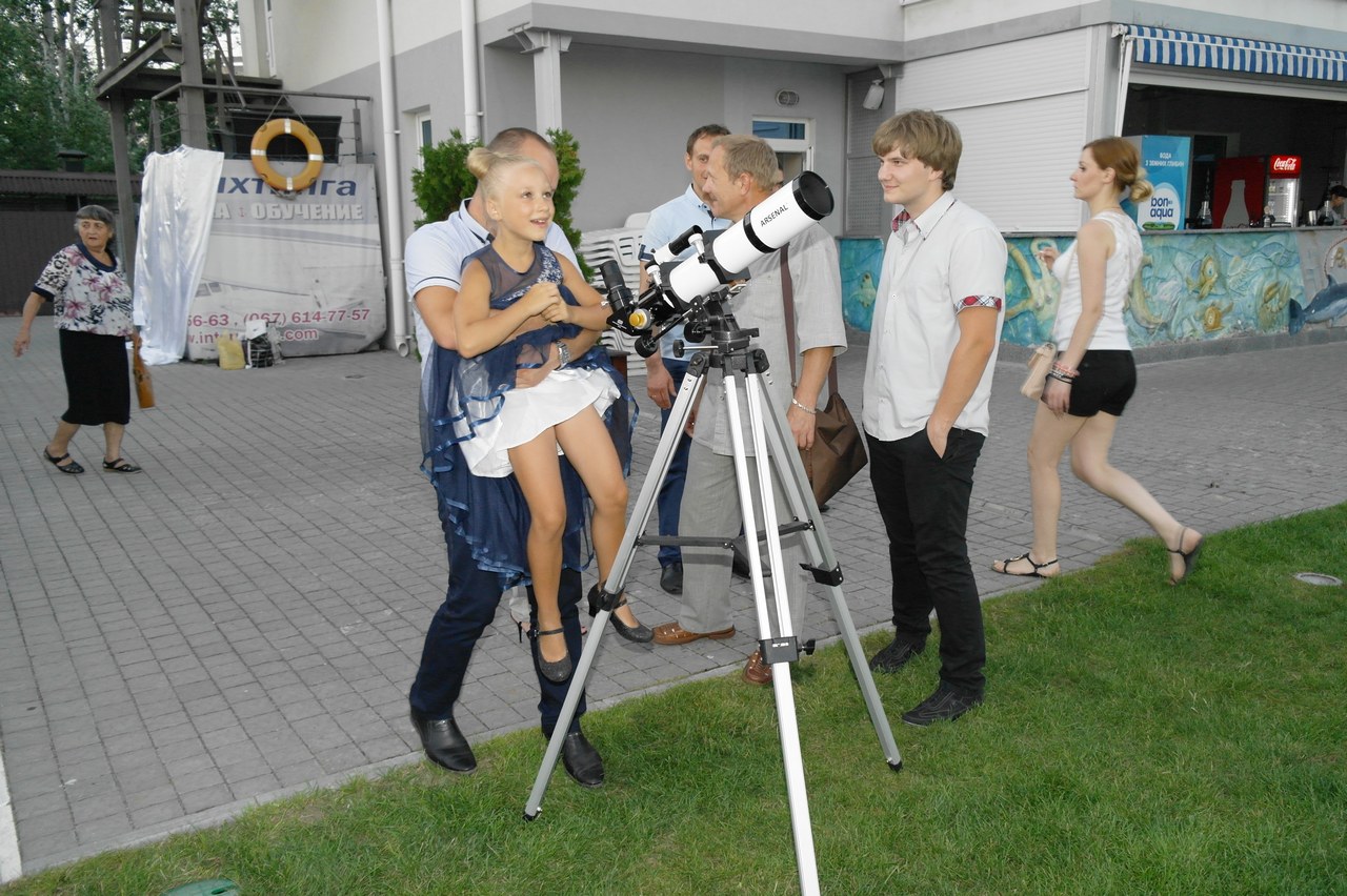 Праздничная часть состоялась в гостиничном комплексе на берегу Днепра. Погода была ясная, и на небе было что посмотреть – в выгодной фазе была Луна (чуть больше половинки), в лучах заходящего Солнца еще можно было рассмотреть Юпитер, левее и ниже Луны недалеко друг от друга расположились Марс и Сатурн.