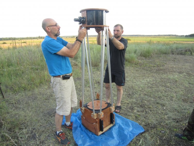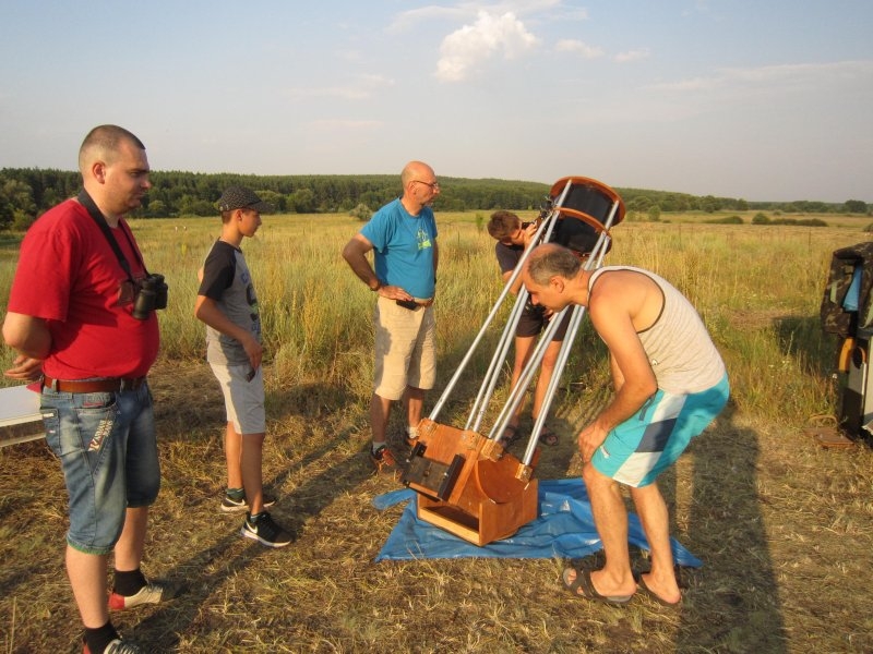 Низкое расположение планет и висевшая над горизонтом дымка не позволили провести полноценные наблюдения, но новички были довольны. После организованного командой красноградских любителей астрономии (и сочувствующих им) отличного ужина наблюдатели оккупировали астроплощадку. Наблюдали, прежде всего, классические для этого времени объекты, демонстрировали их новичкам. Я в течение примерно 30-40 минут пытался в любезно предоставленный мне Олегом Крыклей 305-мм Добсон (изготовленный им собственноручно) найти Плутон, разжалованный астрономами из числа больших планет в карликовые. В принципе, его блеск 14,2m позволял найти с такой апертурой, но высота над горизонтом в 19 градусов и сильная дымка не позволили это сделать.